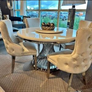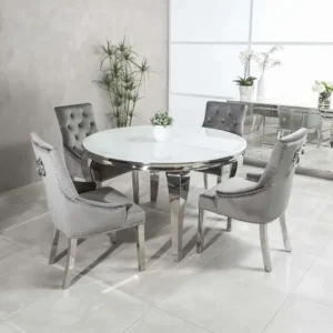 Sword Round Silver Dining Table with 4 Bombay Grey Silver Chairs Set