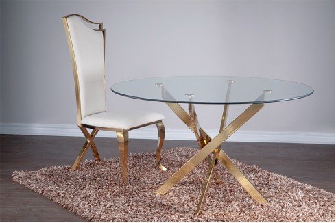 Elevate your dining experience with the 51″ Gold Sword Dining Table, a stunning centerpiece featuring a luxurious gold stainless steel base and a sleek 12mm tempered clear glass top. Perfect for any modern dining space, this table combines elegance and durability, making it a timeless addition to your home.