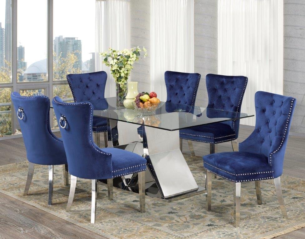 is a stunning piece of furniture that adds a touch of glamour to any dining room. Its sleek design features a mirrored base and a clear glass tabletop, creating a reflective and illuminating effect. The table is paired with six upholstered chairs in a rich blue velvet fabric, featuring elegant tufting and silver nailhead trim. The chairs’ curved backs and comfortable seats provide a luxurious dining experience.