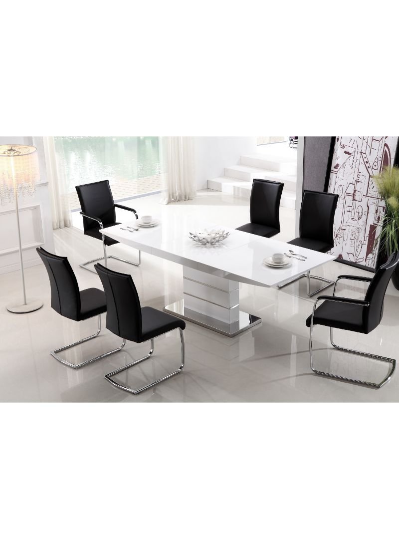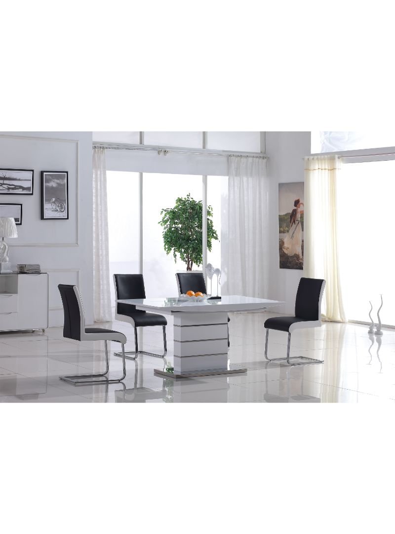 The Castor Dining Table features a sleek, modern design with a high-gloss white finish and a double extension feature. Ideal for accommodating guests, it includes extension boards that store conveniently within the tabletop. The shiny stainless steel middle leg lines and base plate add a sophisticated touch, making this table both elegant and versatile for various dining occasions.