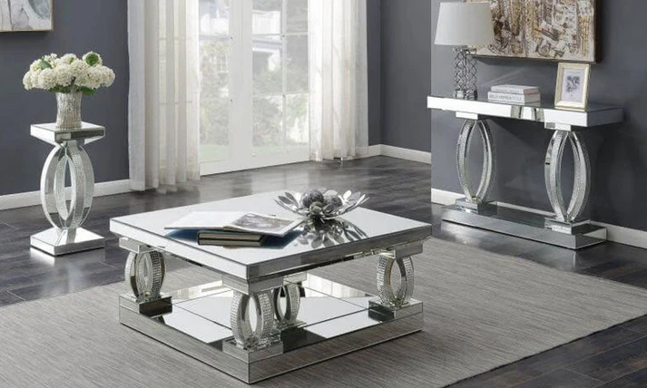 Rectangular-shaped mirror with shimmer silver frame finished.