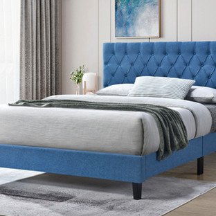 1. Crafted from solid and engineered wood and upholstered with luxurious velvet, with crystal tufting for a hint of sparkle. 2. 12 horizontal wood slats with metal center support and legs 3. NO box spring required. 4. Weight Capacities(lb): Queen: 400 King: 500 5. ONE BOX SET 6. Mattress not included 7. Queen 62″x86″x46″ King 80″x86″x46″