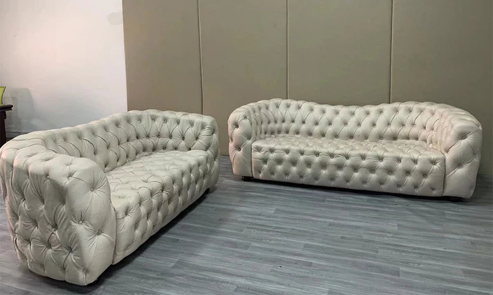 This is a simple two-piece living room set- a sofa seat, and a love seat. The colour is a unique shade of beige.