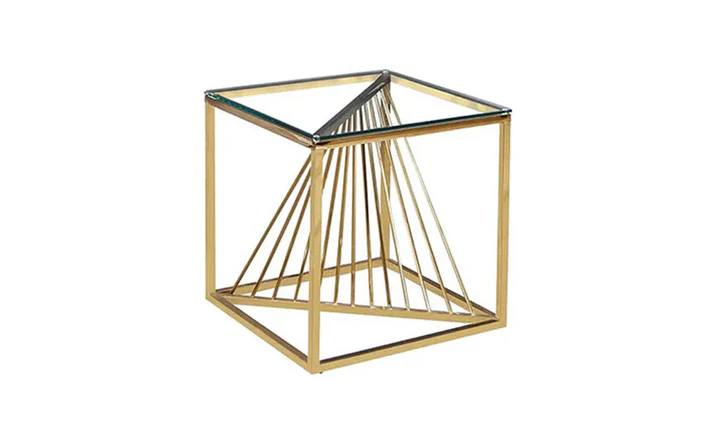 This is an absolute stunning gold steel spike end table. Moreover, it is square with high transparency.