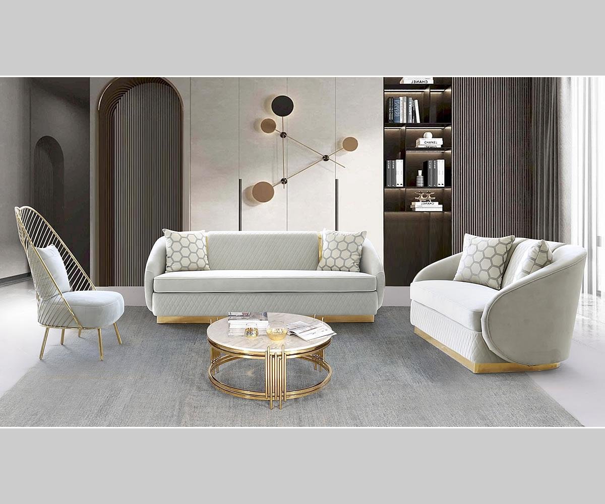 The Giselle Sofa Set blends modern design with traditional elegance, making it a stylish addition to any living room. Featuring plush velvet upholstery and a swivel chair in printed linen fabric, this set stands out with its gold stainless steel base. It also includes tossed pillows for added comfort and flair.